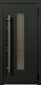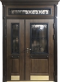 Парадная входная дверь с верхней вставкой, остеклением и решетками